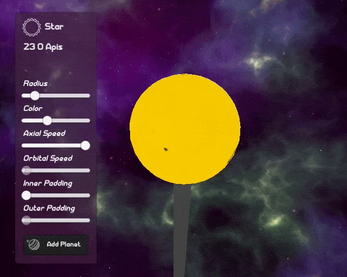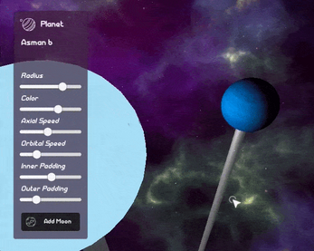 - Properties include color, radius, padding, axial speed (rotation), and orbital speed (revolution)